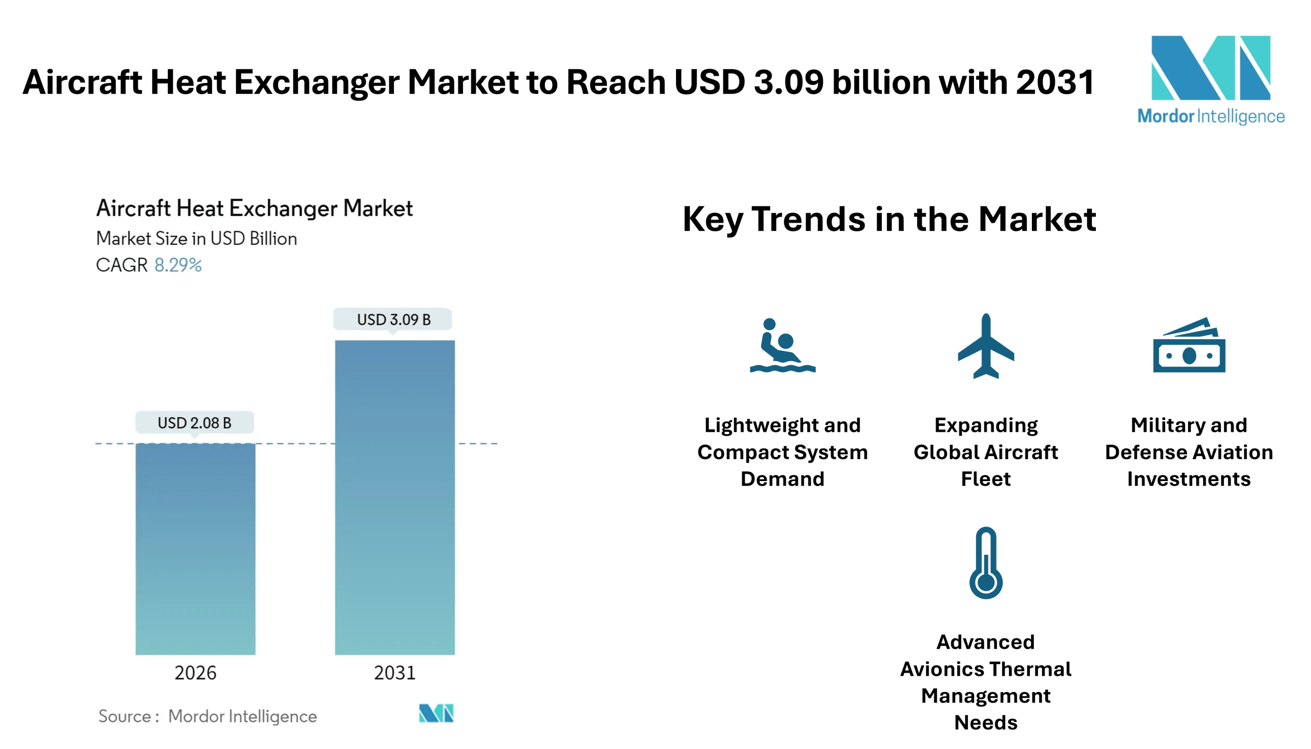 According to Mordor Intelligence, the aircraft heat exchanger market size in 2026 is estimated at USD 2.08 billion, growing from a 2025 value of USD 1.92 billion, with 2031 projections showing USD 3.09 billion at a CAGR of 8.29% over the 2026–2031 period.