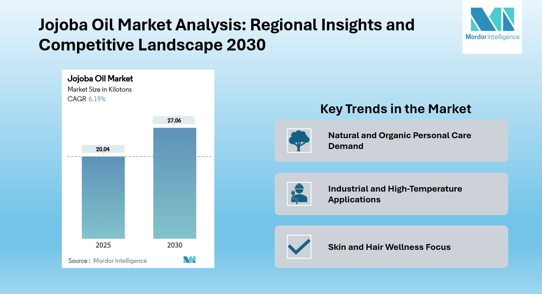 The global Jojoba Oil Market is estimated at 20.04 kilotons in 2025 and projected to reach 27.06 kilotons by 2030, reflecting a CAGR of 6.19% during the forecast period. The market’s expansion is supported by rising consumer awareness of natural and clean-label personal care products, alongside emerging industrial applications of jojoba oil as a biodegradable high-performance lubricant.