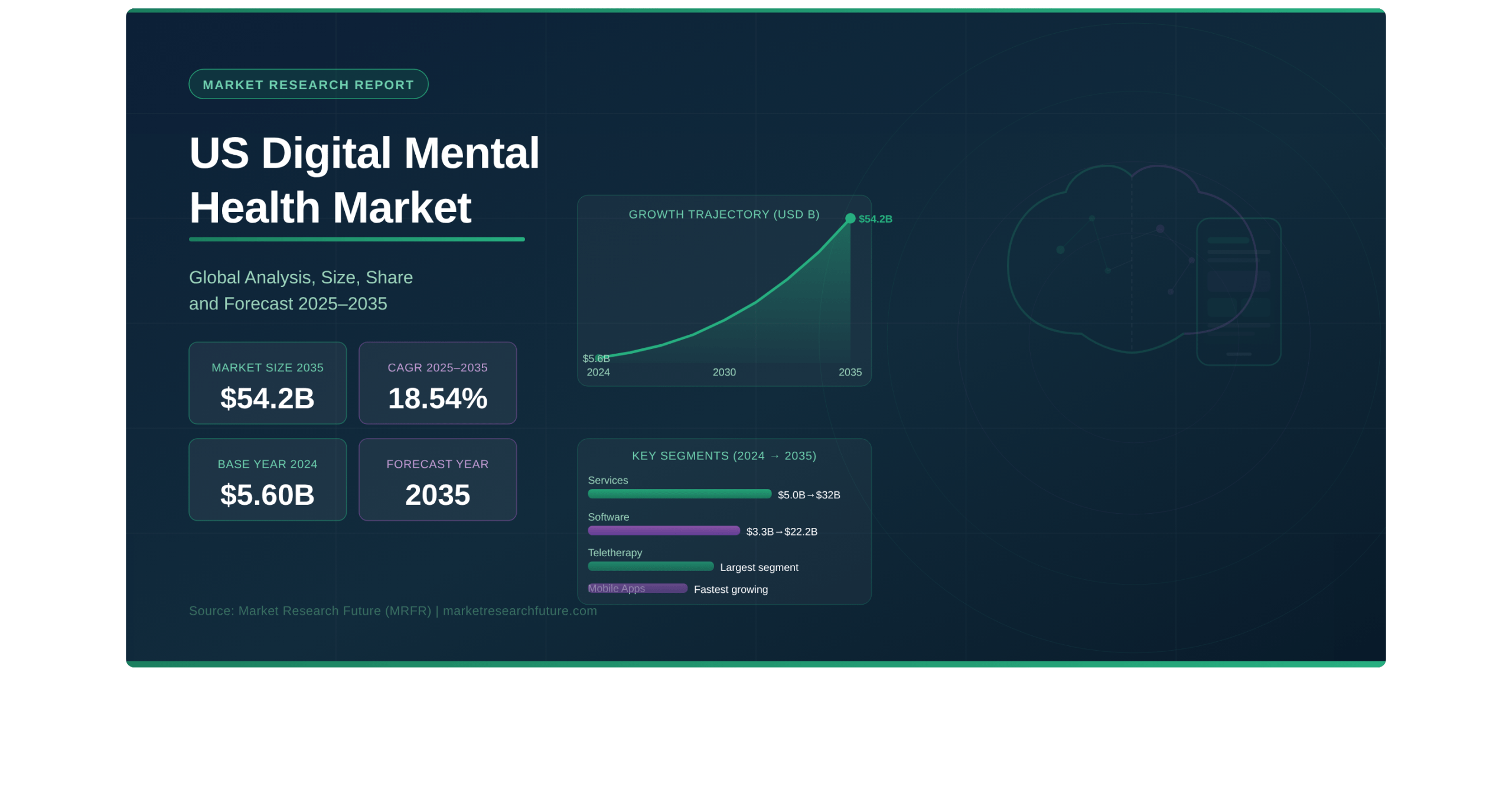 Pune, India — The US Digital Mental Health Market is on an exceptional growth trajectory, according to the latest US Digital Mental Health Market report published by Market Research Future (MRFR). Valued at USD 5.60 billion in 2024, the market is projected to grow at a remarkable compound annual growth rate (CAGR) of 18.54% from 2025 to 2035, reaching USD 54.2 billion by 2035. This explosive expansion positions the US as the world’s most advanced and investment-intensive digital mental healthcare ecosystem — a trend that resonates strongly with the broader Longevity Market size narrative, where mental wellness has emerged as a defining pillar of healthy aging and life extension strategies worldwide.